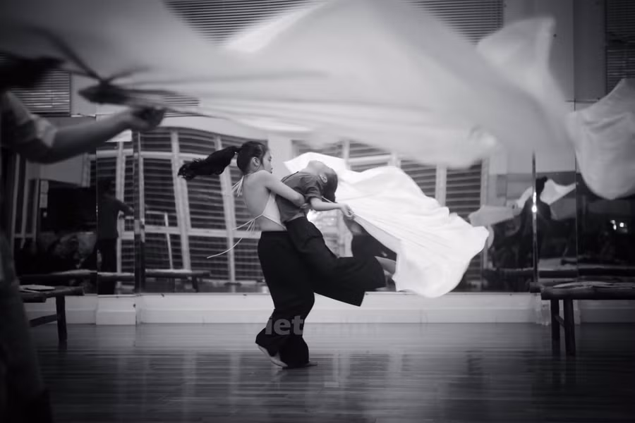 Đều đặn 3 buổi mỗi tuần, căn phòng tập tại sân bóng Trung Kính Hạ (Cầu Giấy, Hà Nội) luôn rộn ràng bởi tiếng cười của lớp dạy khiêu vũ thể thao. Cặp đôi vũ công nổi tiếng Hà Thành, Viết Thành-Quỳnh Trang vừa là thầy vừa là những người anh, người chị dạy bảo, dìu dắt những đứa trẻ có niềm đam mê vũ đạo.