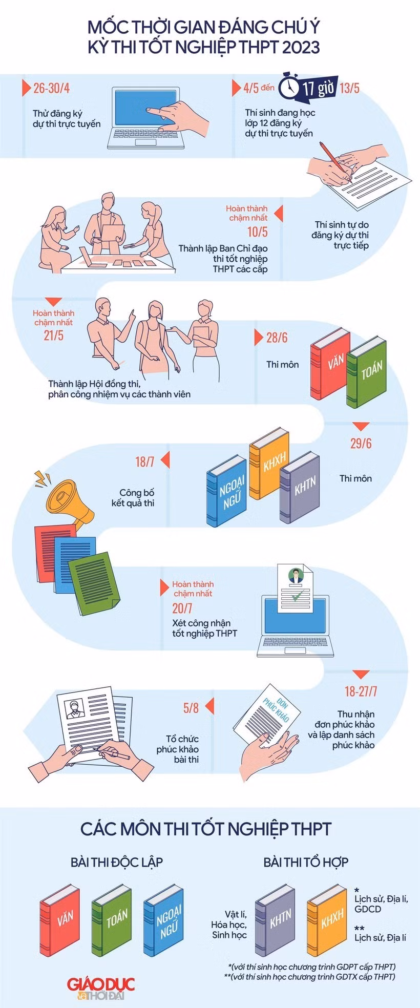 Kỳ thi tốt nghiệp THPT năm 2023 tổ chức thi 5 bài thi, gồm: 3 bài thi độc lập là Toán, Ngữ văn, Ngoại ngữ; 1 bài thi tổ hợp Khoa học Tự nhiên gồm các môn thi thành phần Vật lí, Hóa học, Sinh học;1 bài thi tổ hợp Khoa học Xã hội gồm các môn thi thành phần Lịch sử, Địa lí, Giáo dục công dân đối với thí sinh học chương trình giáo dục phổ thông cấp THPT hoặc các môn thi thành phần Lịch sử, Địa lí đối với thí sinh học chương trình Giáo dục thường xuyên cấp THPT.