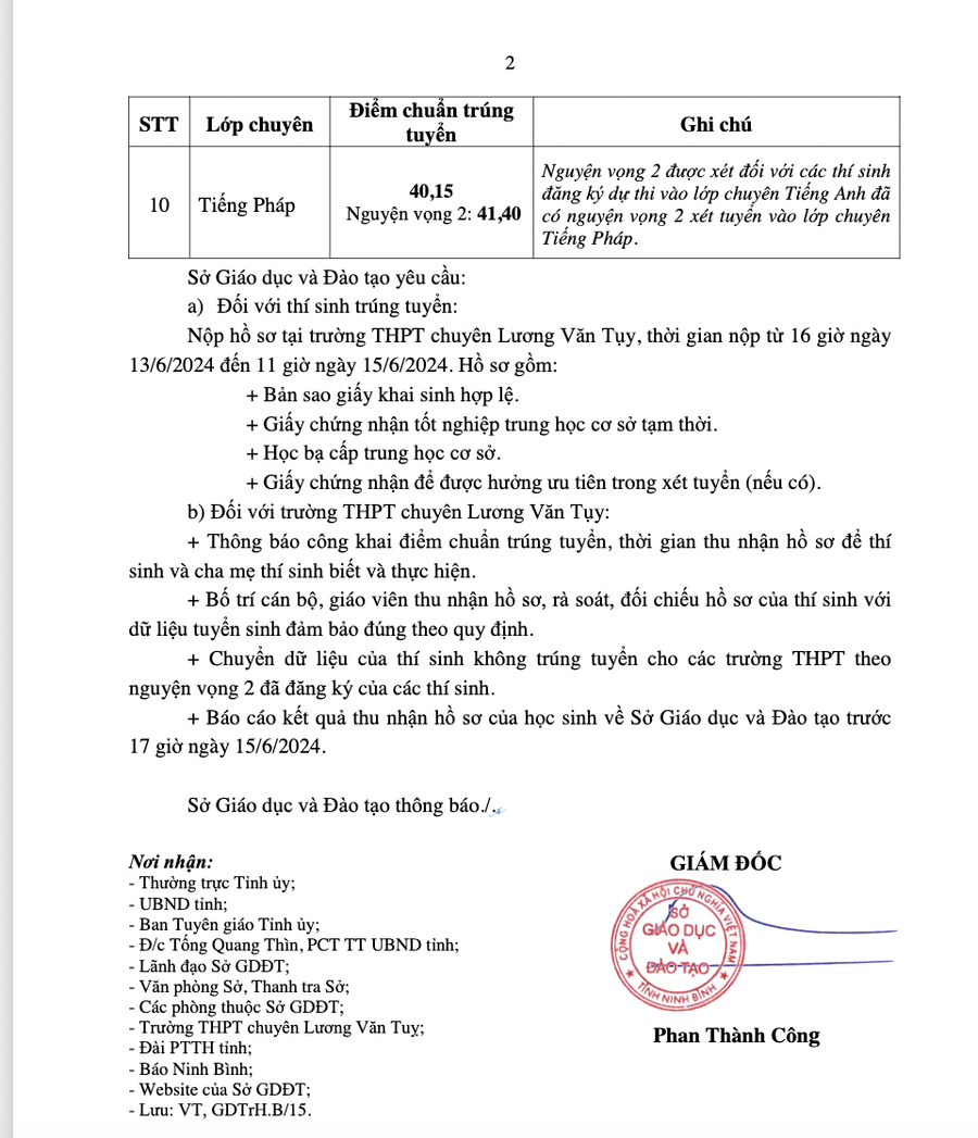 Sở GD&ĐT Ninh Bình lưu ý, thí sinh trúng tuyển nộp hồ sơ tại Trường THPT chuyên Lương Văn Tụy, thời gian nộp từ 16 giờ ngày 13/6 đến 11 giờ ngày 15/6/2024.