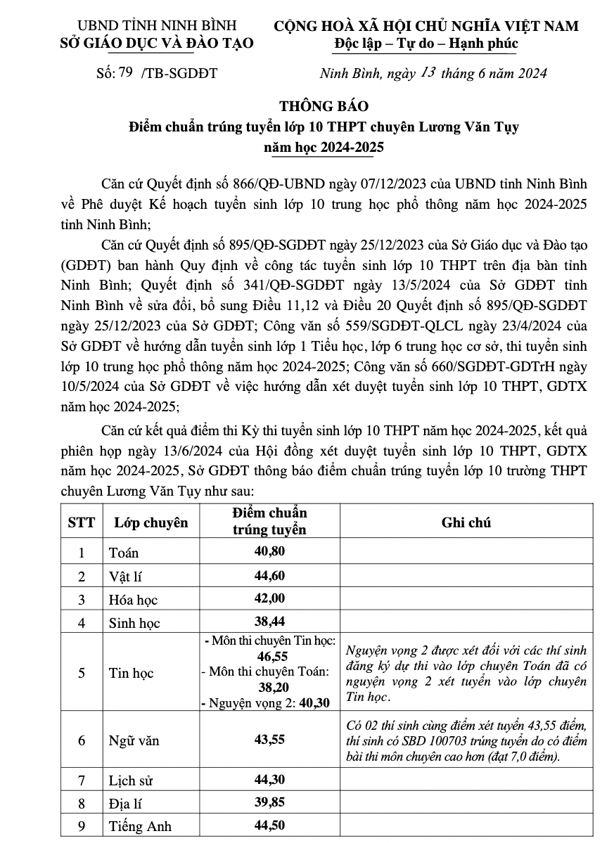 Điểm chuẩn trúng tuyển lớp 10 Trường THPT chuyên Lương Văn Tụy năm học 2024 - 2025