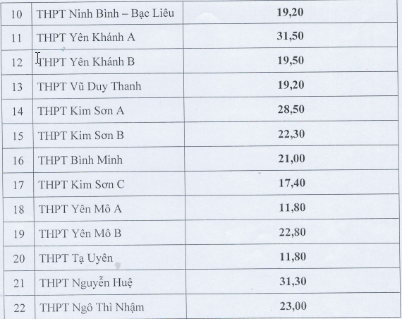 Các trường THPT: Nho Quan C, Ninh Bình - Bạc Liêu, Yên Khánh B, Kim Sơn C, Yên Mô A, Tạ Uyên duyệt những thí sinh đủ điểm trúng tuyển theo quy chế. Việc xét tuyển bổ sung, xét tổng điểm thi từ cao đến thấp của tất cả các thí sinh nộp hồ sơ xét tuyển bổ sung cho đến khi đủ chỉ tiêu còn thiếu. Thời gian nhận hồ sơ xét tuyển bổ sung tại các trường trên từ 14h00 ngày 14/6 đến 1 lh30 ngày 16/6 năm 2017.