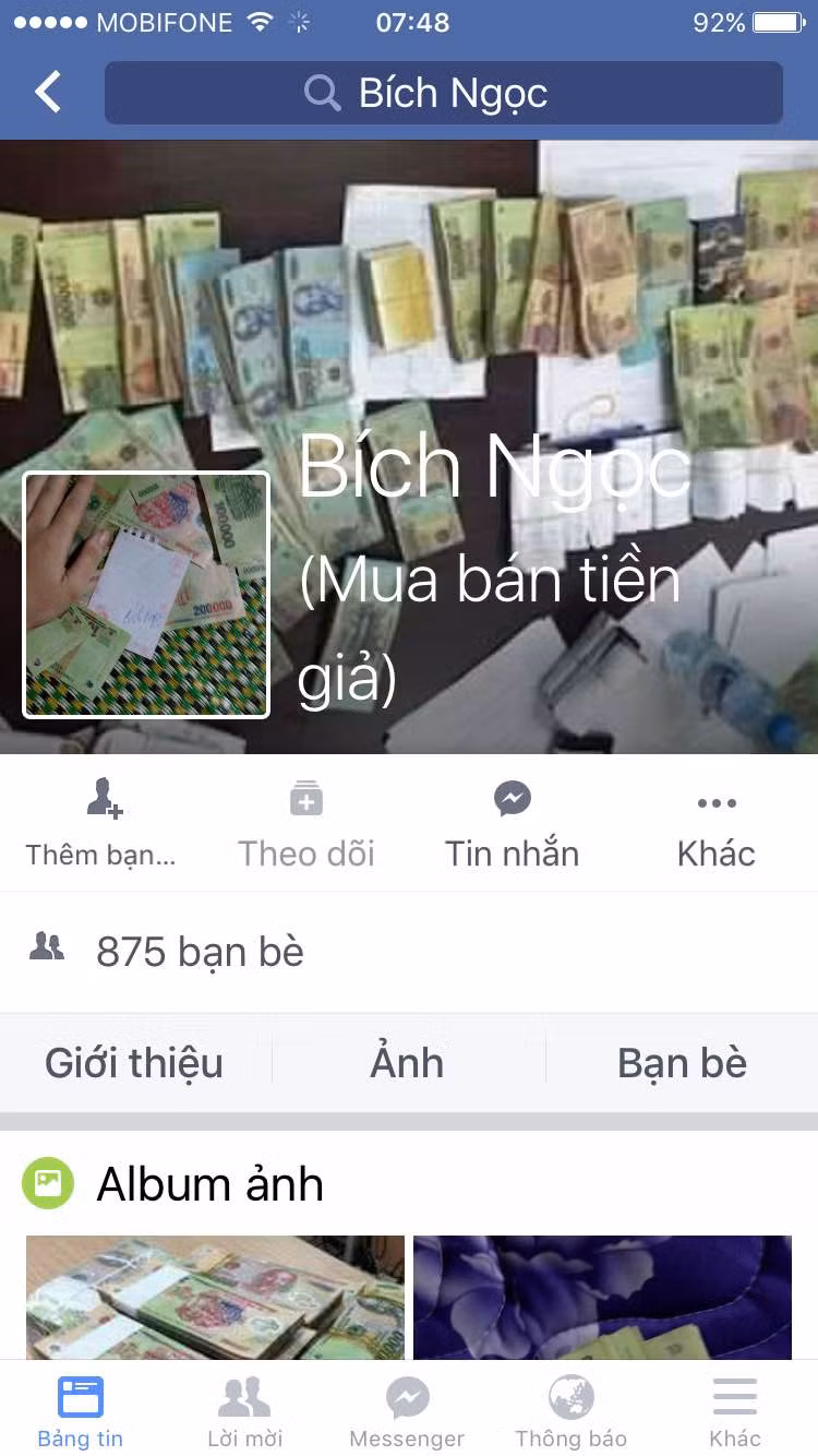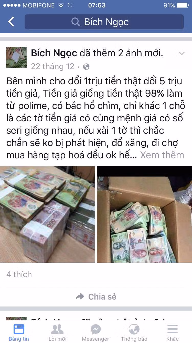 Tài khoản trên cũng đăng tải vô số hình ảnh được cho là tiền giả, loại polymer với nhiều mệnh giá khác nhau: 50.000 đồng, 100.000 đồng, 200.000 đồng và 500.000 đồng. Tiền được bó thành từng cọc, chất đầy trên bàn và được người rao bán đảm bảo “giống thật tới 98%” kèm theo những lời mời gọi hấp dẫn. Không ít người hám lợi đã thực hiện giao dịch, trao đổi số điện thoại, tài khoản ngân hàng với các đối tượng cung cấp tiền giả.