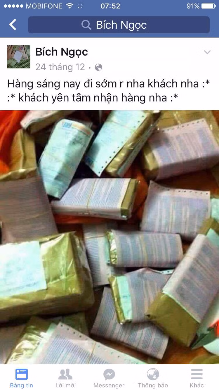 Theo lời rao trên trang facebook Ngọc Bích (Mua bán tiền giả), để mua được tiền giả, người mua chỉ cần inbox cho chủ nhân của facebook và để lại thông tin, sau đó sẽ có người giao hàng. Khi nào người nhận kiểm tra tiền giả, lúc ấy mới đưa tiền thật.