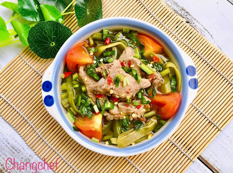 Bộ sưu tập các món canh chua của Trang: Nấu cá lóc với bông so đũa, rau rút và nấm; sườn nấu rau rút; bông so đũa nấu tôm và ngó sen cá lóc.