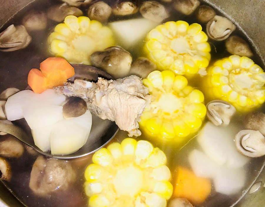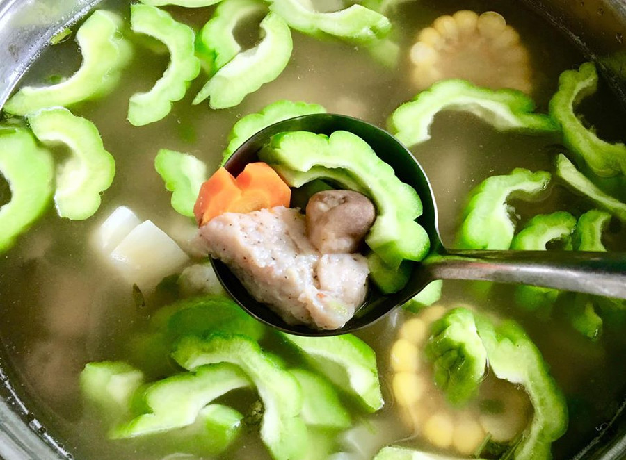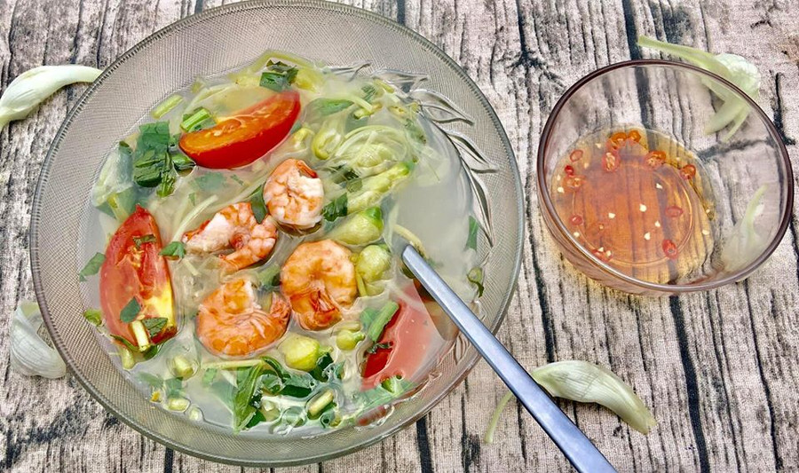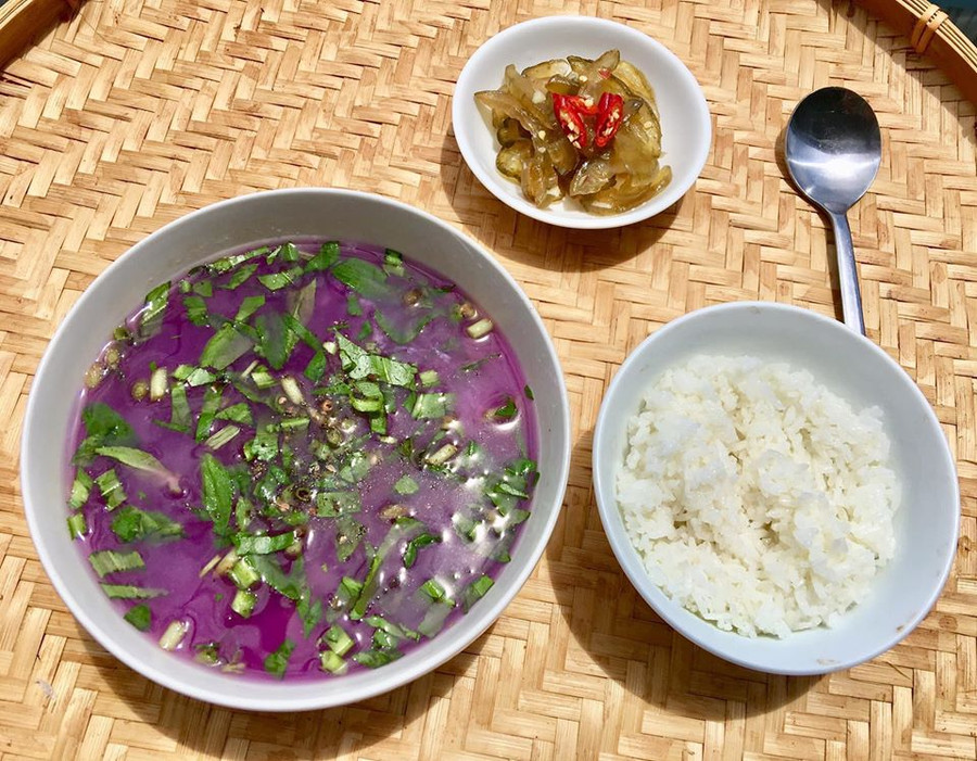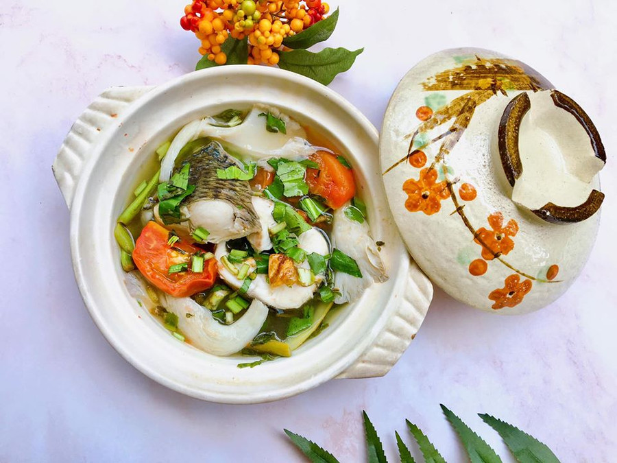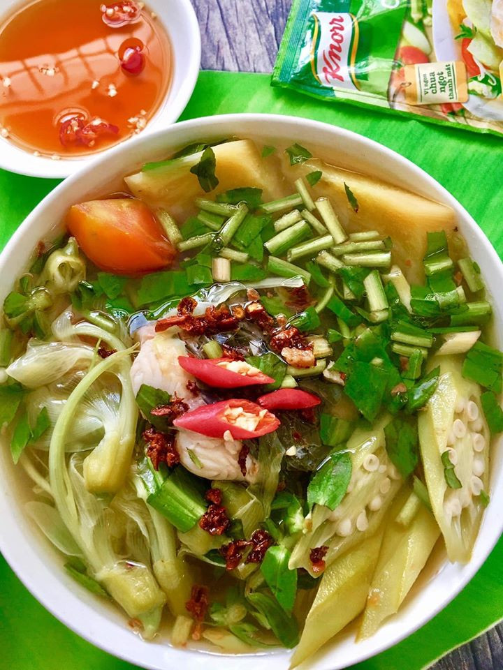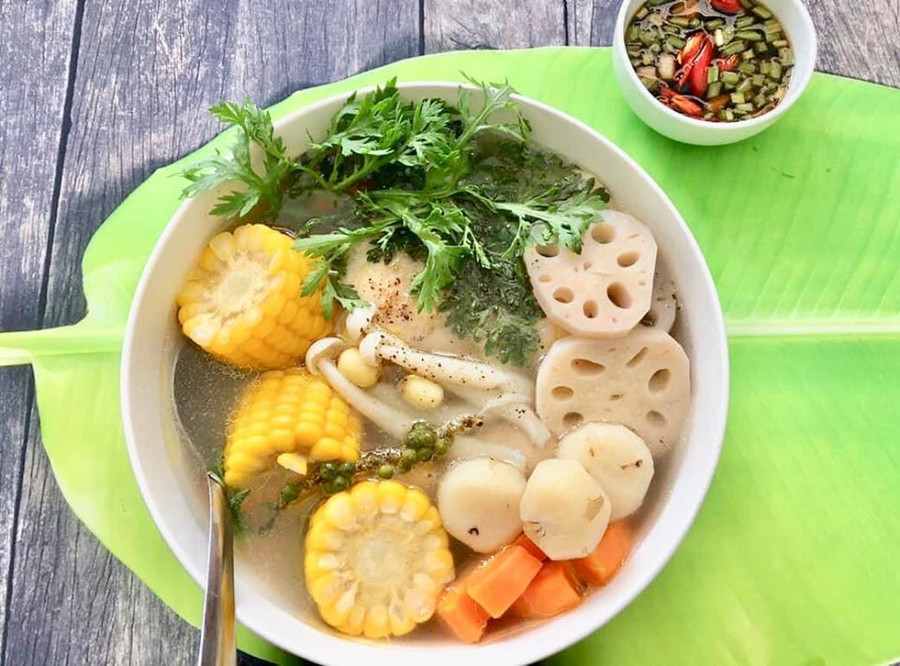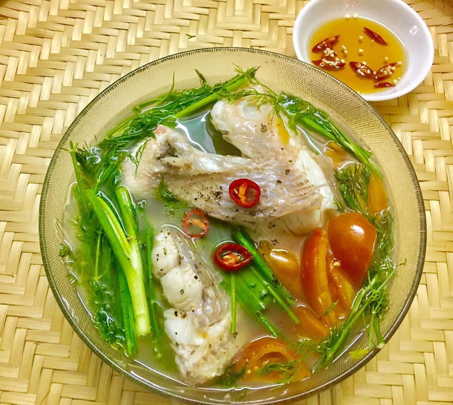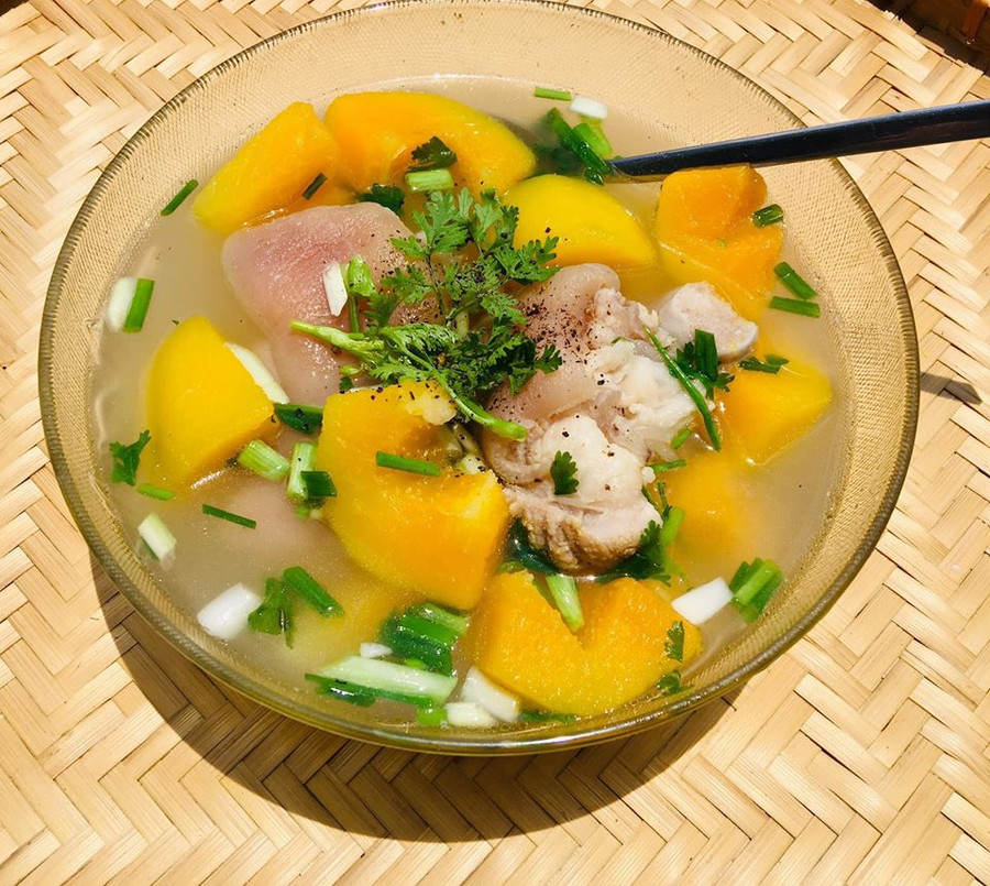 Từ trên xuống dưới: Canh cá diêu hồng nấu riêu, canh cá diêu hồng nấu măng chua, canh bí đỏ tôm tươi và canh bắp cải nấu sườn.