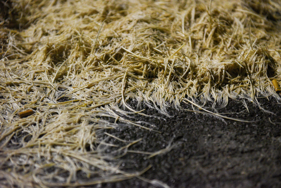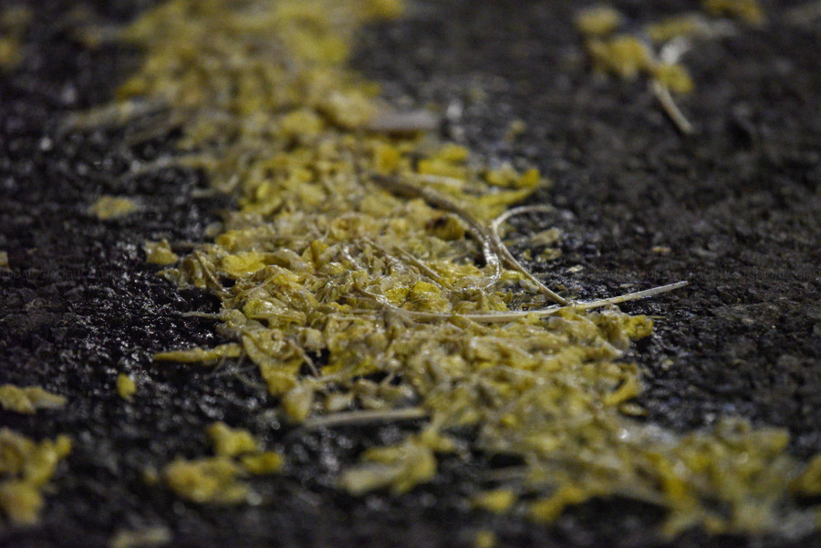 | Lông gia cầm được vứt, phơi khá dày trên mặt đường. |