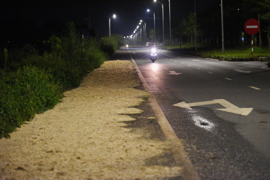 | Lông gia cầm được vứt, phơi chiếm hết 1 làn đường. |