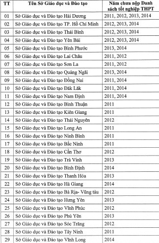 Tuy nhiên đến nay còn một số Sở GD&ĐT chưa nộp Danh sách công nhận tốt nghiệp các năm từ 2011 đến 2014.