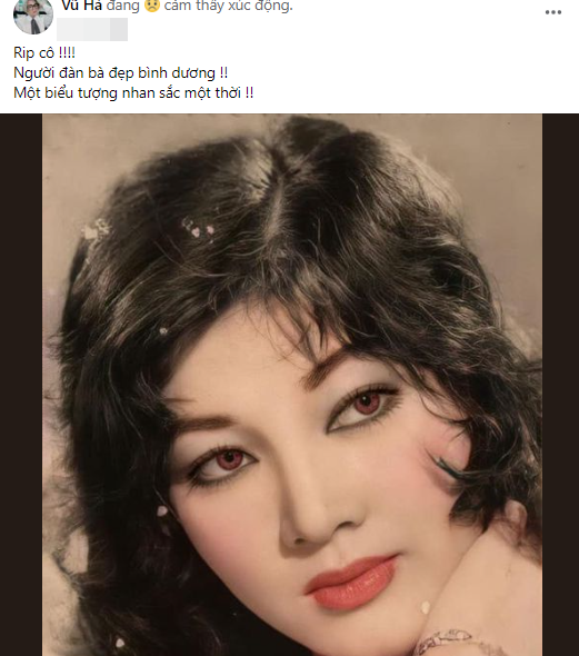 Trên trang cá nhân của ca sĩ Vũ Hà, anh cũng chia sẻ tin buồn và hình ảnh của Thẩm Thúy Hằng: “Rip cô!!!! Người đàn bà đẹp Bình Dương. Biểu tượng nhan sắc một thờiI!!”.