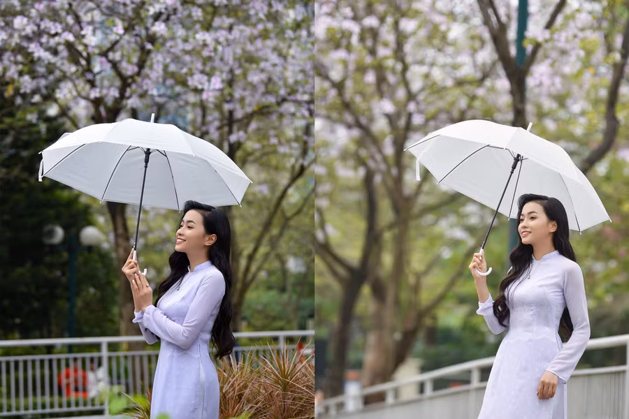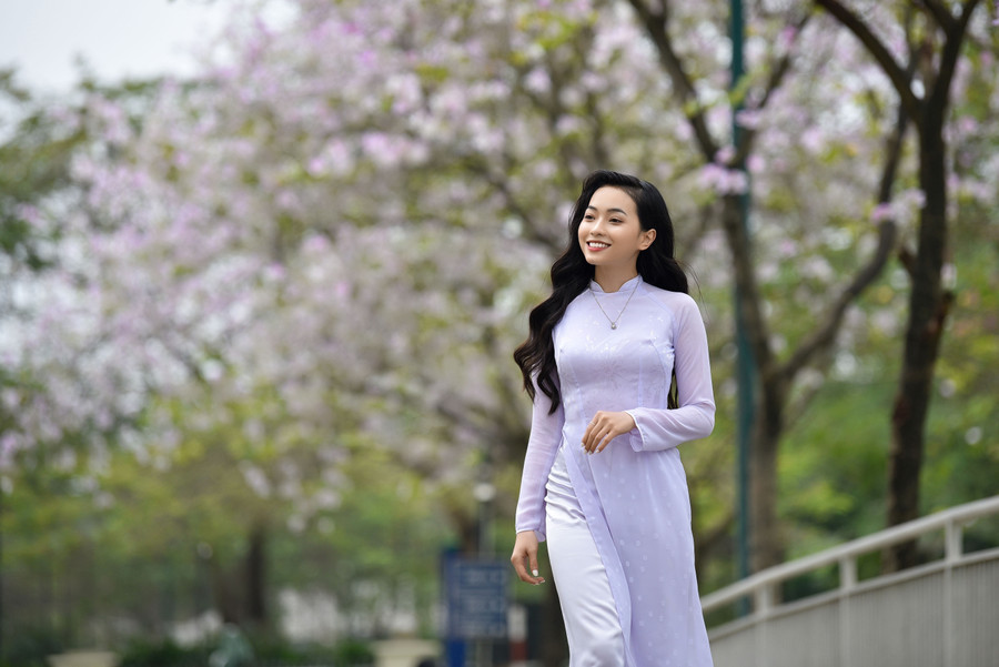 | Xuất hiện trong không gian hoa ban thơ mộng, nữ MC bồi hồi nhớ lại khi mặc chiếc áo dài mang nhiều kỷ niệm tuổi học trò. |