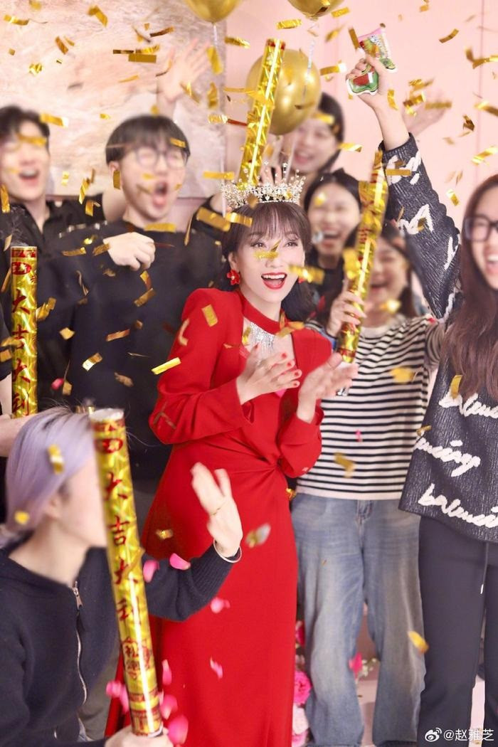 Mặc chiếc váy màu đỏ tươi và đội vương miện, Triệu Nhã Chi trông xinh đẹp và quyến rũ như một nàng công chúa.