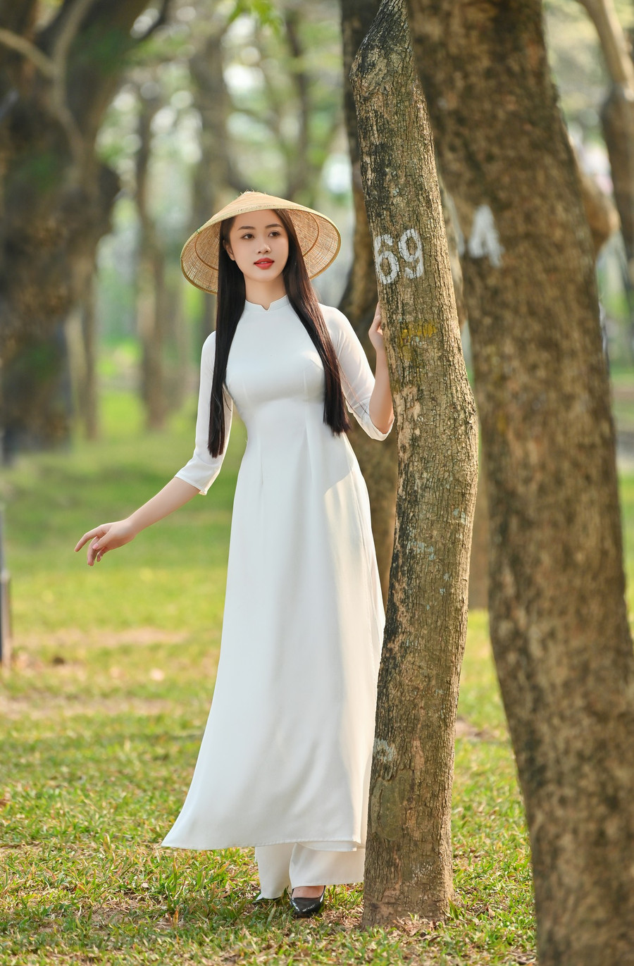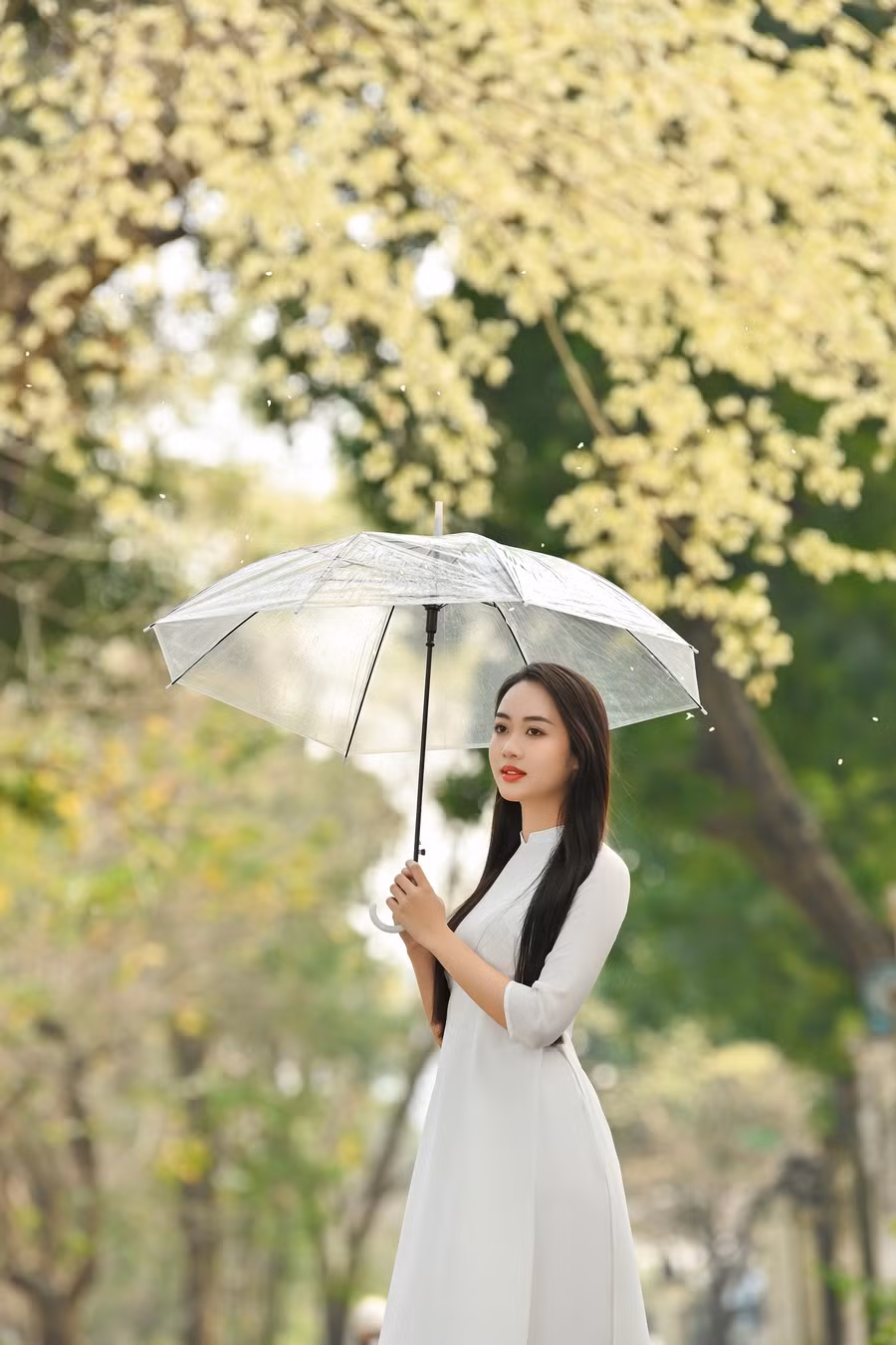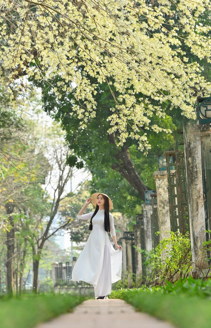 | Vũ Như Quỳnh bên hoa sưa đầy thơ mộng. |
