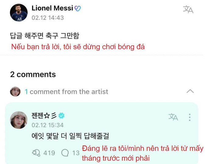 Trên nền tảng người hâm mộ Hàn Quốc Weverse, một tài khoản đóng giả là Messi – sử dụng tên của anh và ảnh của anh làm ảnh đại diện – đã viết cho Yunjin: "Nếu bạn bình luận, tôi sẽ ngừng chơi bóng đá".