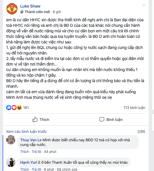 | Trên page công đồng cư dân HH Linh Đàm rất nhiều người đã up lên những dòng thông tin về mùi lạ của nguồn nước. |