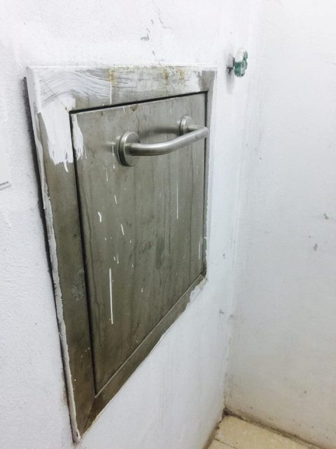 Cư dân tầng 25, vì họng rác hôi hám, đã lấy gạch mở và chèn cửa cầu thang bộ ,cho mùi hôi thoát ra cầu thang bộ, bất chấp mối lo cháy nổ, ghi dòng chữ yêu cầu xử lý họng rác mới được đóng cửa.