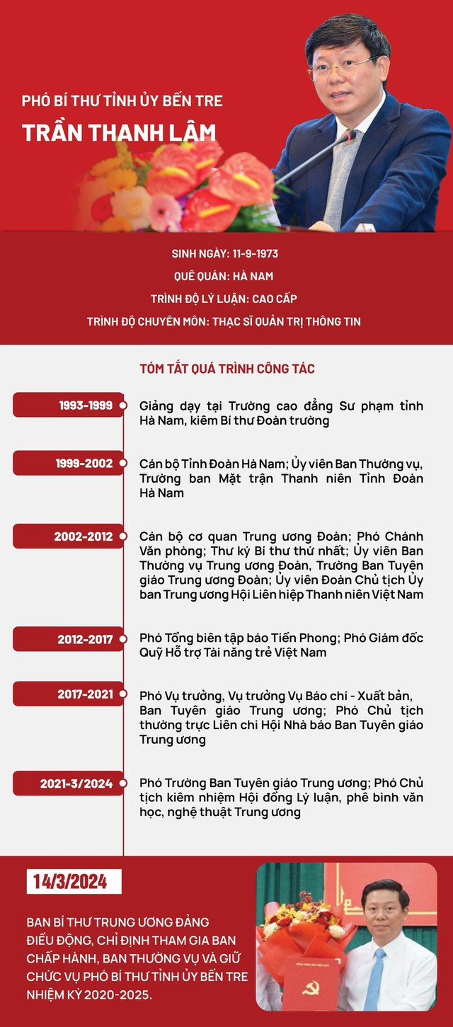 Phát biểu nhận nhiệm vụ, Phó Bí thư Tỉnh ủy Bến Tre Trần Thanh Lâm khẳng định nhiệm vụ mới được giao là vinh dự lớn, đồng thời cũng là trách nhiệm rất nặng nề. Với cương vị mới, trọng trách mới, nhiệm vụ mới đòi hỏi bản thân phải không ngừng học tập, rèn luyện vượt qua khó khăn, thử thách; nỗ lực tận tâm, tận tụy, tâm huyết, trách nhiệm vì sự phát triển của tỉnh Bến Tre.