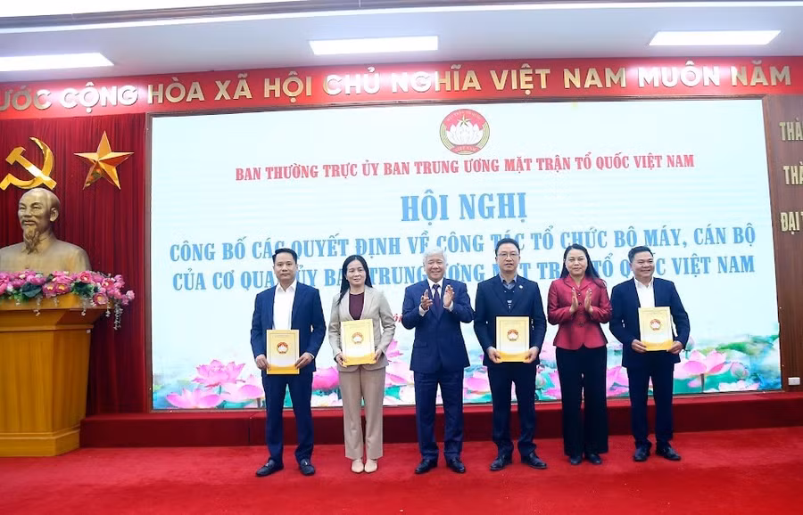 Ngày 30/12/2024, căn cứ vào cơ cấu tổ chức bộ máy của Quyết định số 217-QĐ/TW, Ủy viên Bộ Chính trị, Bí thư Trung ương Đảng, Chủ tịch Ủy ban Trung ương MTTQ Việt Nam đã trao các quyết định điều động, bổ nhiệm chức danh lãnh đạo, quản lý của một số ban, đơn vị thuộc Cơ quan Ủy ban Trung ương MTTQ Việt Nam.