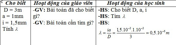 Ví dụ: Trong thí nghiệm Y-âng về giao thoa ánh sáng biết D = 3m; a = 1mm, khoảng vân đo được là 1,5 mm. bước sóng của ánh sáng chiếu vào hai khe là bao nhiêu?