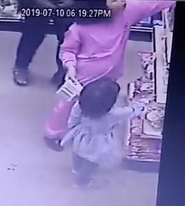 Tên yêu râu xanh sau đó chỉ rời khỏi hai bé gái vài giây và trở lại với hành động táo bạo hơn, gã đẩy cô bé về phía trước trong khi đang cố giả vờ lấy một món đồ từ trên giá hàng.