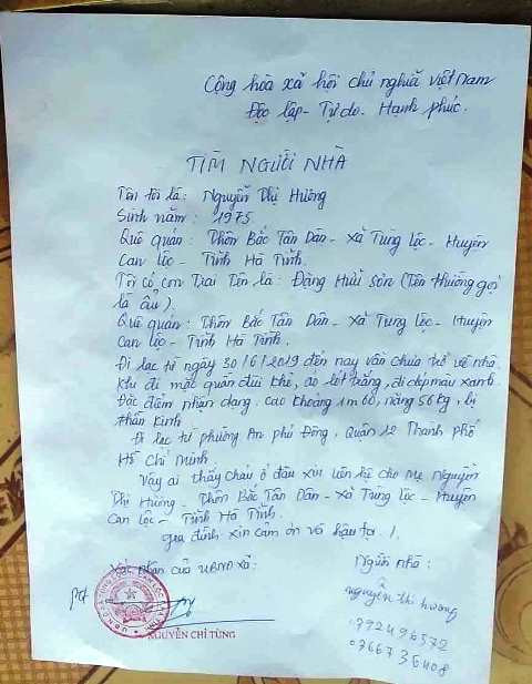 Liên quan đến sự việc, ông Nguyễn Chỉ Tùng (Phó Chủ tịch UBND xã Tùng Lộc) cho biết: “Thông tin gia đình anh Vượng, chị Hương ở trên địa bàn xã có con trai tên là Đặng Hữu Sơn mất tích bí ẩn ở TP HCM là đúng. Hơn nửa tháng qua, gia đình và người thân đang phối hợp để tìm kiếm anh Sơn nhưng hiện chưa có thông tin gì. Hi vọng ai biết thông tin anh ấy ở đâu thì báo cho người nhà để gia đình sớm đoàn tụ”.