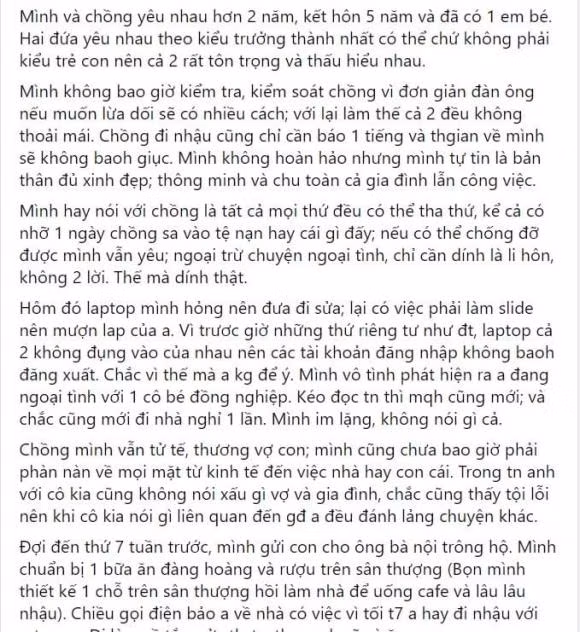 Chồng mình vẫn tử tế, thương vợ con, mình cũng chưa bao giờ phải phàn nàn về mọi mặt từ kinh tế đến việc nhà hay con cái. Trong tin nhắn anh với cô kia cũng không nói xấu gì vợ và gia đình, chắc cũng thấy tội lỗi nên khi cô kia nói gì liên quan đến gia đình đều đánh lảng chuyện khác.