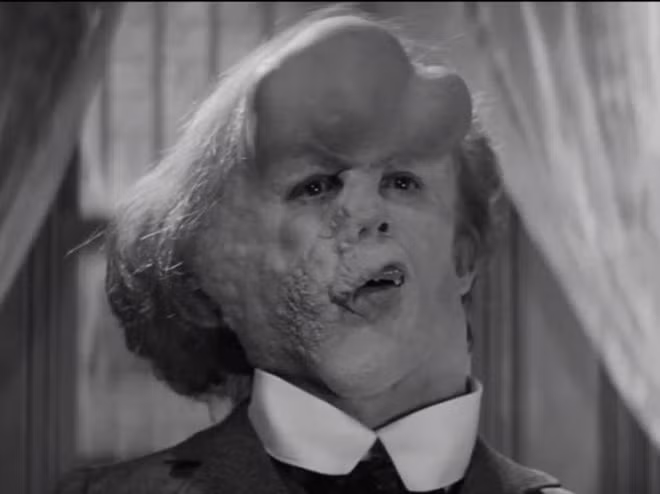 Nhân vật "Người voi" John Merrick trong bộ phim The Elephant Man (trái) và gương mặt Joseph Merrick được chụp bởi Hiệp hội X quang Bắc Mỹ ngoài đời thực.