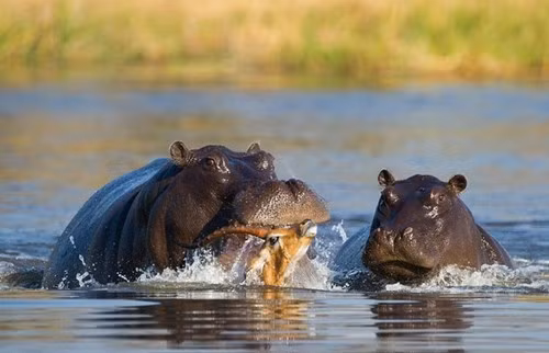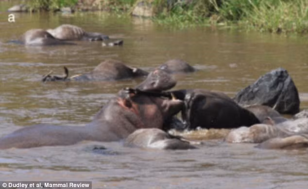 Hình ảnh hai con hà mã cố gắng tấn công và ăn thịt một con hà mã con.