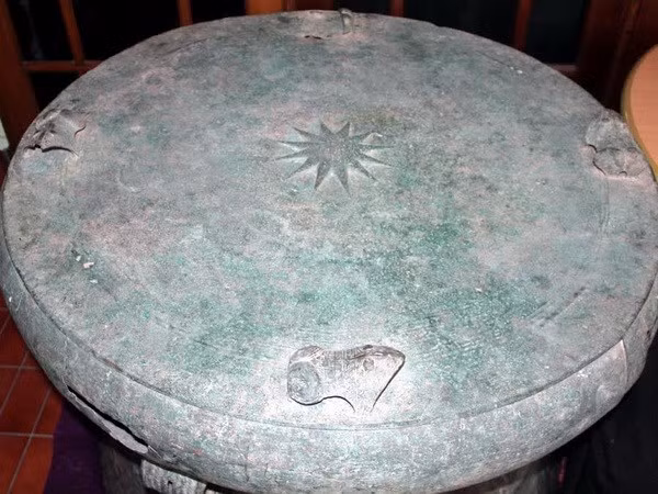 Theo quan sát của phóng viên TTXVN, trên mặt chiếc trống vừa được phát hiện có 4 khối tượng cóc trong khi giữa mặt trống là ngôi sao 12 cánh.