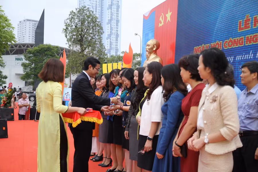 Thứ trưởng Nguyễn Văn Phúc trao biểu trưng của ngày hội cho lãnh đạo các đơn vị