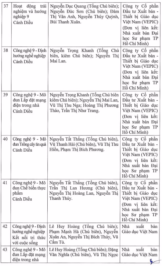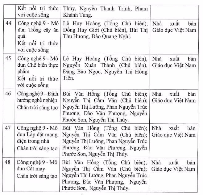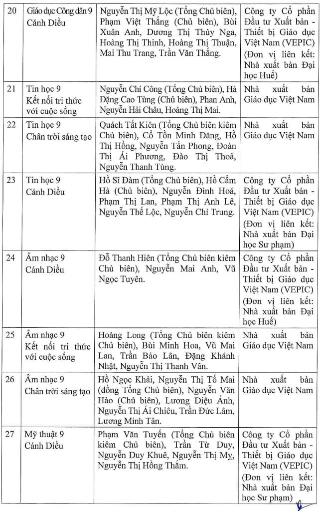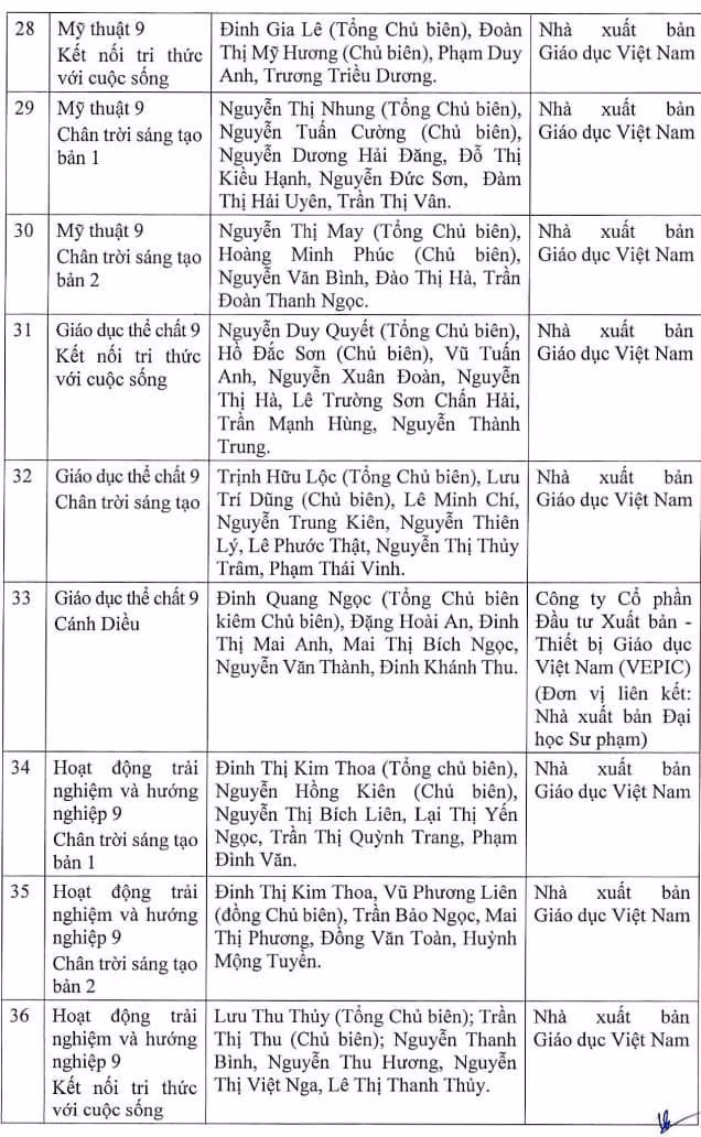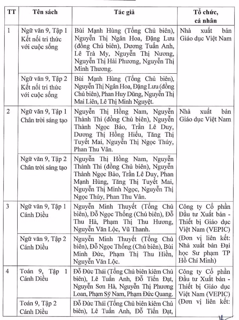 Danh mục gồm 48 sách giáo khoa của các môn học, hoạt động giáo dục dành cho học sinh lớp 9 sẽ được sử dụng trong các cơ sở giáo dục phổ thông từ năm học 2024-2025. Đây là các sách giáo khoa mới được biên soạn theo Chương trình GDPT 2018.