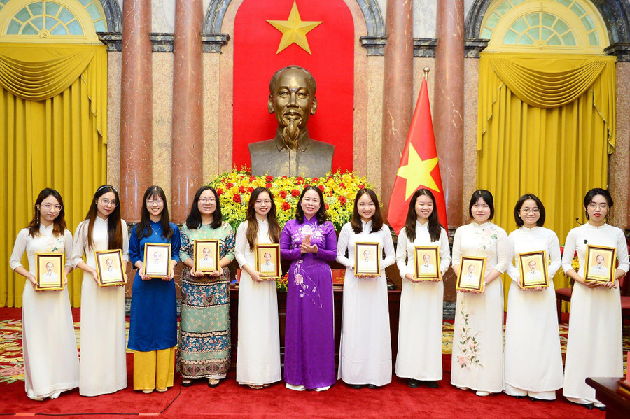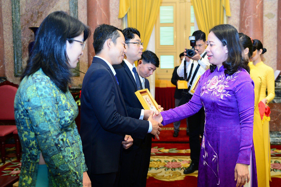 | Phó Chủ tịch nước Võ Thị Ánh Xuân tặng quà cho 30 tài năng trẻ tại buổi gặp mặt. |