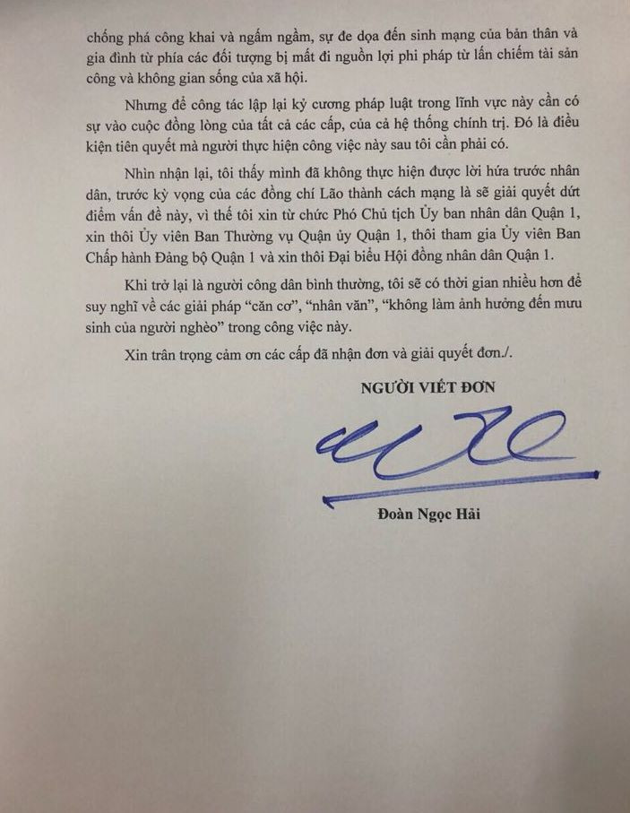 Và lý do sau cùng được ông Hải viết trong đơn là thấy mình "không thực hiện được lời hứa trước nhân dân và kỳ vọng của các đồng chí lão thành cách mạng sẽ giải quyết dứt điểm vấn đề này, vì thế tôi xin từ chức phó chủ tịch quận 1".