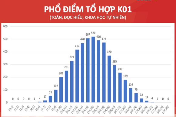 Kết quả thi của tổ hợp K01 dao động từ 4,72 – 27,37 điểm. Điểm trung bình là 15,50 điểm; điểm số có nhiều thí sinh đạt nhất là 16,75 điểm.