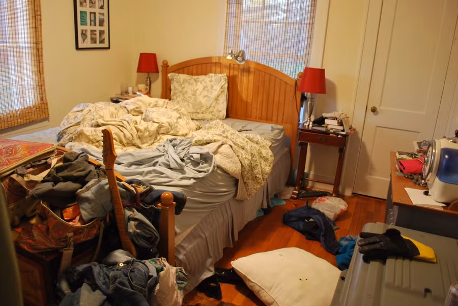 Trong phòng ngủ là nơi dành riêng cho các cặp đôi, chính vì vậy phòng ngủ không nên để bừa bãi, lộn xộn với nhiều dây điện chằng chịt, tủ quần áo dơ bẩn... sẽ tạo ra nguồn sát khí, dễ gây khẩu thiệt thị phi, vợ chồng cãi vã, hôn nhân đổ vỡ dễ rơi vào tình trạng đường ai nấy đi.