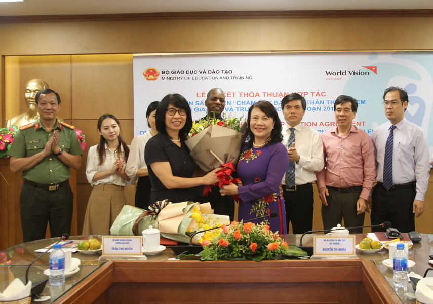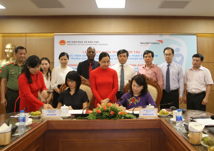 Thứ trưởng Bộ GD&ĐT Nguyễn Thị Nghĩa và bà Trần Thu Huyền- Trưởng đại diện Tổ chức Tầm nhìn Thế giới tại Việt Nam chủ trì lễ kí kết. Cùng dự còn có lãnh đạo các đơn vị chức năng của Bộ GD&ĐT, Bộ LĐTB&XH, Bộ Công an, Bộ VHTTDL cùng nhiều cơ quan tổ chức trong nước và quốc tế.