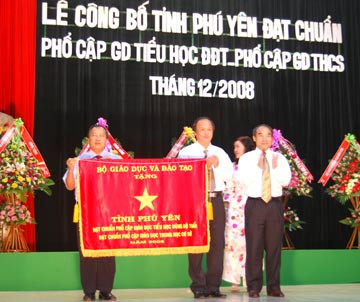 (GD&TĐ) - Chiều ngày 1/8/2009 tại tỉnh Phú Yên đã tổ chức Lễ công bố tỉnh Phú Yên đạt chuẩn Phổ cập Tiểu học đúng độ tuổi và Phổ cập Giáo dục Trung học cơ sở thời điểm tháng 12/2008. Đến dự có các đồng chí Đào Tấn Lộc - Ủy viên BCH TƯ đảng, Bí thư Tỉnh ủy; Phạm Đình Cự - Phó Bí thư thường trực Tỉnh ủy; Tiến sĩ Nguyễn Vinh Hiển - Thứ trưởng Bộ GD - ĐT;