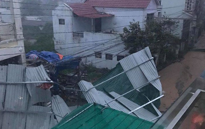 TP Tuy Hòa (Phú Yên) đã bị mất điện hoàn toàn. Ngoài đường phố gió gầm rít từng hồi, những tiếng mái tôn va đập vào nhau chát chúa.