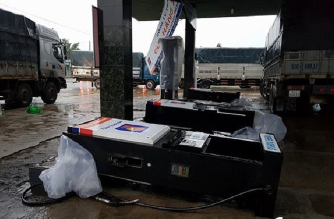 Sức bão còn quật đổ cả cột bơm cây xăng ở Nha Trang (Khánh Hòa).