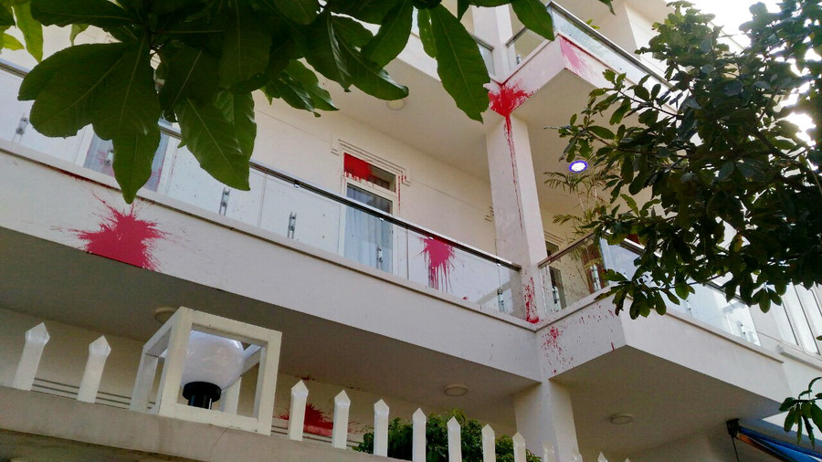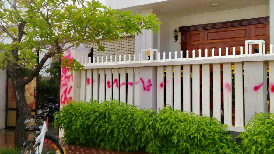 Theo quan sát của chúng tôi, rất nhiều vết sơn màu đỏ do kẻ xấu ném vào vách tường và cửa kính bên hông căn nhà. Sơn được chứa trong chai thủy tinh nên nhiều mảnh vỡ rơi xuống hành lang hai tầng trên và nền sân. Trên bề mặt cổng nhà và tường xây ở phía trước là những vết sơn đỏ phun từ bình xịt, trong đó có vết sơn phun ghi tên chủ nhân căn nhà kèm theo từ ngữ thô tục, một bóng đèn tròn trang trí trên tường xây bị đập vỡ, hai cây kiểng bị chặt phá. Với những dấu vết để lại tại hiện trường có thể dự ước thời gian kẻ xấu “khủng bố” bằng sơn không dưới 10 phút.