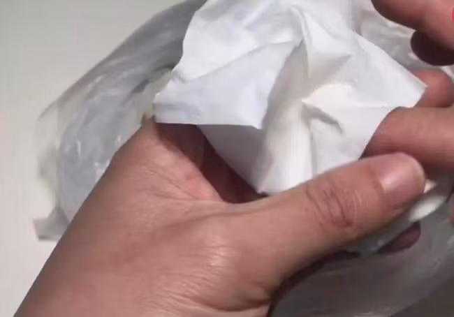 – Sau khi cho tỏi vào túi nilong, bạn đổ một ít baking soda vào mẩu giấy nhỏ…