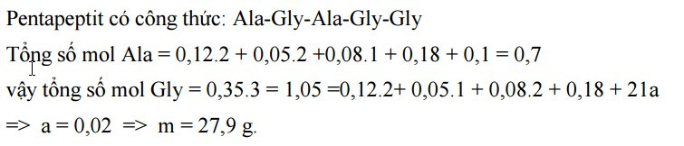 Câu 2: cho X là hexapeptit Ala-Gly-Ala-val-gly-val và Y là tetrapeptit Gly-Ala-Gly-Glu. Thủy phân hoàn toàn m gam hỗn hợp X và Y thu đuợc 4 amino axit, trong đó có 30 gam glyxin và 28,48g alanin.