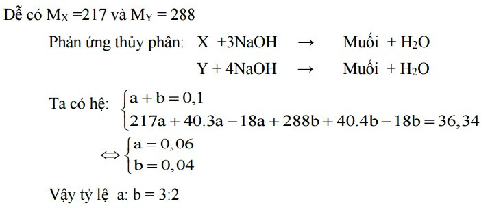 Câu 11: Hỗn hợp X gồm tripeptit A và tetrapeptit B đều được cấu tạo bởi glyxin và alanin. Thành phần phần trăm khối lượng nitơ trong A và B theo thứ tự là 19,36% và 19,44%. Thủy phân hoàn toàn 0,1 mol hỗn hợp X bằng một lượng dung dịch NaOH vừa đủ, thu được dung dịch Y. Cô cạn dung dịch Y thu được 36,34 gam hỗn hợp muối. Tỉ lệ mol giữa A và B trong hỗn hợp X là: A. 2:3. B. 3:7. C. 3:2. D. 7:3.