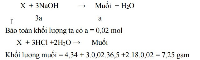 Câu 9. Thủy phân hoàn toàn 4,34 gam tripeptit mạch hở X (được tạo nên từ hai α – amino axit có cùng công thức dạng H2NCxHyCOOH) bằng dung dịch NaOH dư, thu được 6,38 gam muối. Mặt khác thủy phân hoàn toàn 4,34 gam X bằng dung dịch HCl dư, thu được m gam muối. Giá trị của m là: A. 6,53. B. 7,25. C. 5,06. D. 8,25.