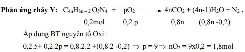 Câu 8: Tripeptit mạch hở X và Tetrapeptit mạch hở Y đều được tạo ra từ một aminoacid no,mạch hở có 1 nhóm –COOH và 1 nhóm –NH2. Đốt cháy hoàn toàn 0,1 mol X thu được sản phẩm gồm H2O,CO2 và N2 trong đó tổng khối lượng CO2 và H2O bằng 36,3(g). Nếu đốt cháy hoàn toàn 0,2 mol Y thì số mol O2 cần phản ứng là? A. 2,8. B. 1,8. C. 1,875. D. 3,375