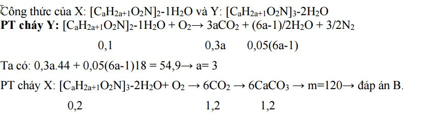 Câu 7: (Đề thi tuyển sinh đại học Khối B- 2010): Đipeptit mạch hở X và mạch hở Y đều được tạo ra từ một loại amino axit no, mạch hở có một nhóm NH2 và một nhóm COOH. Đốt cháy hoàn toàn 0,1 mol Y thu được sản phẩm gồm CO2, H2O, và N2 trong đó tổng khối lượng CO2 và H2O bằng 54,9 gam. Nếu đốt cháy hoàn toàn 0,2 mol X, sản phẩm thu được cho lội qua dung dịch nước vôi trong dư thì thu được m gam kết tủa. Giá trị của m là: A. 45. B. 120. C. 30. D. 60.