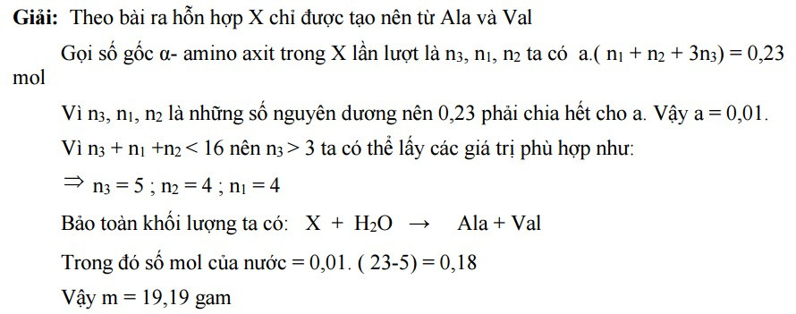 Giải: Theo bài ra nX > 1,772 mmol, nala = 2 mmol, nphe = 2 mmol, ngly = 6 mmol Từ đó ta có trong X chứa 1 Ala và 1 Phe và không quá 3 gốc Gly. Khi thủy phân từng phần thu được Gly-ala và Ala- Gly, vậy Ala phải nằm giữa hai gốc Gly, không có Phe-Gly vậy gốc Gly phải đứng trước gốc Phe, không có Gy-Gly- Phe vậy không có hai gốc Gly gần nhau giữa Ala và Phe. Cấu tạo của X là: Gly-Ala-Gly-Phe hoặc Gly- Gly-Al-Gly-Phe