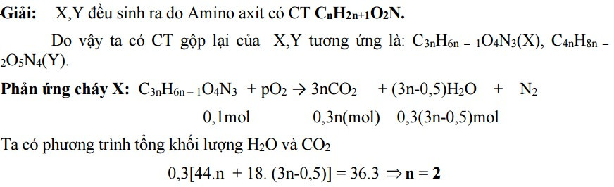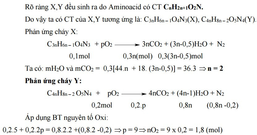 Câu 4:Tripeptit mạch hở X và Tetrapeptit mạch hở Y đều được tạo ra từ một amino axit no, mạch hở có 1 nhóm –COOH và 1 nhóm –NH2. Đốt cháy hoàn toàn 0,1 mol X thu được sản phẩm gồm H2O,CO2 và N2 trong đó tổng khối lượng CO2 và H2O bằng 36,3 gam. Nếu đốt cháy hoàn toàn 0,2 mol Y thì số mol O2 cần phản ứng là: A. 2,8 mol. B. 1,8 mol. C. 1,875 mol. D.3,375 mol.