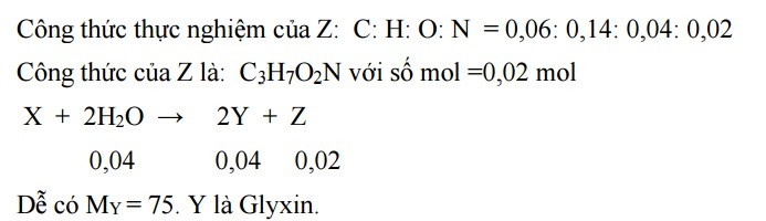 Câu 5: Peptit X bị thủy phân theo phương trình phản ứng: X + 2H2O ->2Y + Z ( trong đó Y và Z là các amino axit) . Thủy phân hoàn toàn 4,06 gam X thu được m gam Z. Đốt cháy hoàn toàn m gam Z cần vừa đủ 1,68 lít khí O2 (đktc) thu được 2,64g CO2, 1,26g H2O và 224 ml N2 ( đktc). Biết Z có công thức phân tử trùng với công thức đơn giản nhất. Tên gọi của Y: A. Alanin. B. Axit glutamic. C. Lysin. D. Glyxin.