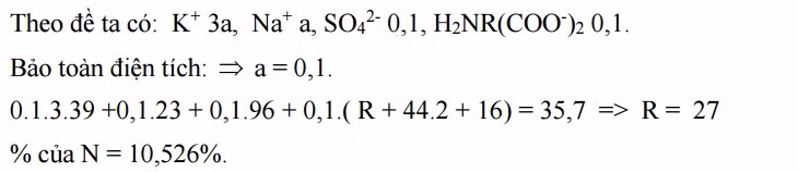 Câu 10: amino axit X có công thức H2NCxHy(COOH)2. Cho 0,1 mol X vào 0,2 lít dung dịch H2SO4 0,5M thu được dung dịch Y. Cho Y phản ứng vừa đủ với dung dịch gồm NaOH 1M và KOH 3M thu được dung dịch chứa 36,7 gam muối. Phần trăm khối lượng của nitơ trong X: A. 11,966%. B. 10,526%. C. 9,524%. D. 10,687%.