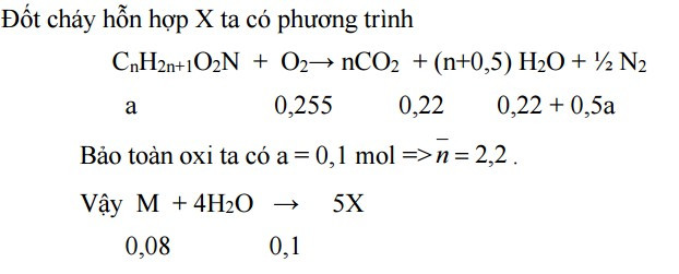 Câu 12: Thuỷ phân hoàn toàn m gam một pentapeptit mạch hở M thu được hỗn hợp gồm hai amino axit X1, X2 (đều no, mạch hở, phân tử chứa một nhóm -NH2 và một nhóm - COOH). Đốt cháy toàn bộ lượng X1, X2 ở trên cần dùng vừa đủ 0,255 mol O2, chỉ thu được N2, H2O và 0,22 mol CO2. Giá trị của m là: A. 6,34. B. 7,78. C. 8,62. D. 7,18.